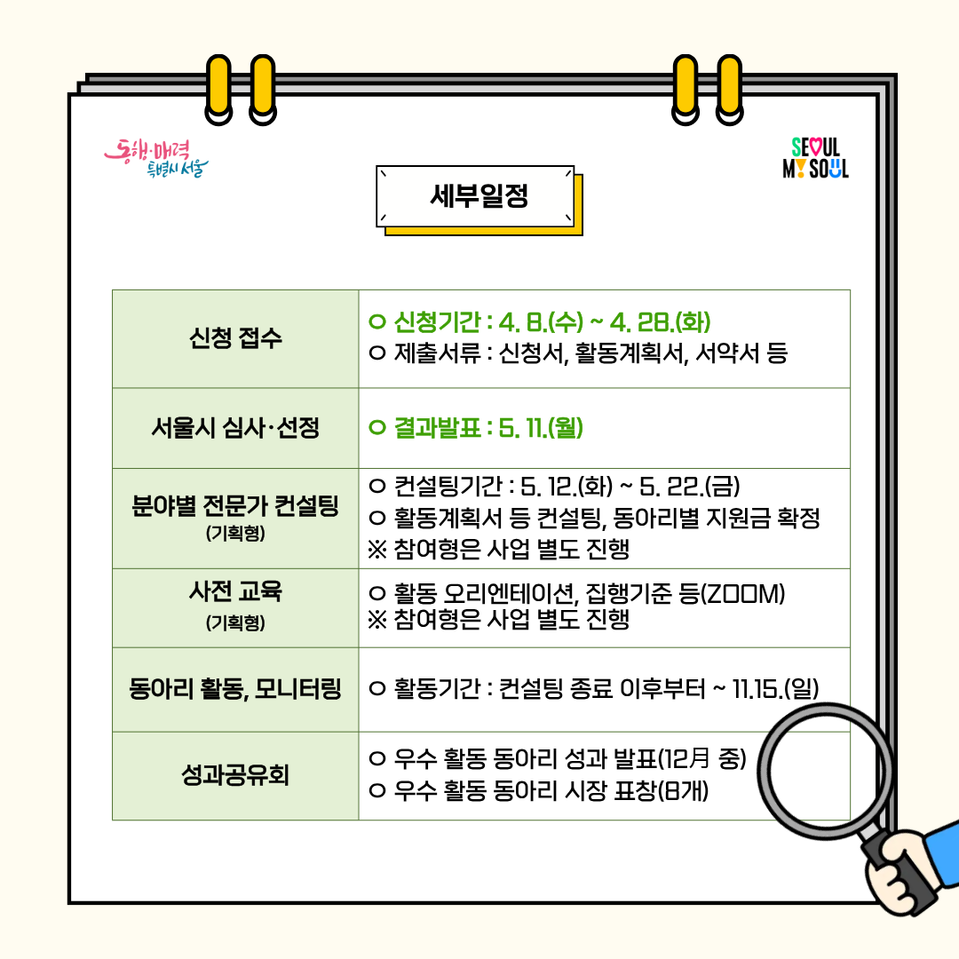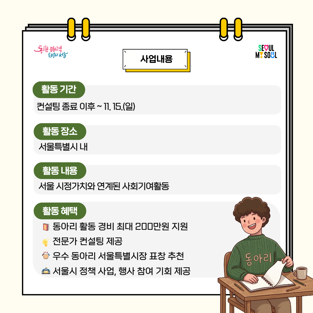 서울시에서는 대학생 동아리 활동을 활성화하고 지역사회 문제 개선에 기여할 수 있도록 지원하기 위해「서울 동아리ON(대학생 동아리 지원)」사업을 추진 중에 있습니다.